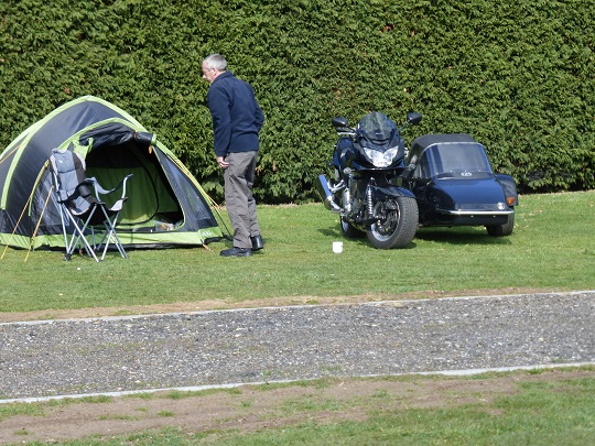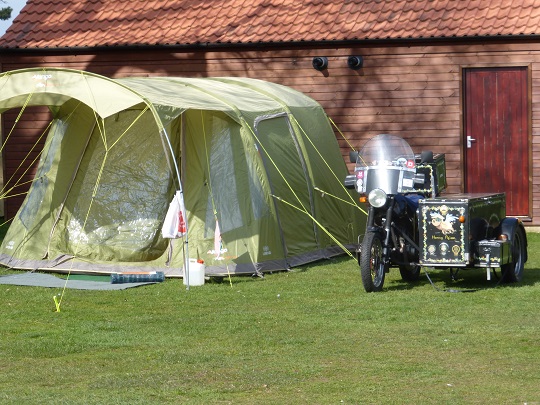 On returning to the campsite, l seem to have a EXPOSED POLE sticking through the tent canvas! Only 10 years old and one careful owner?. However help was at hand the Tri Anglia Wheels Sidecar Club provide the rally field “Grand Pavilion” plus a very large black leather settee for my nighty lumbers, only FIVE STAR for Michael!