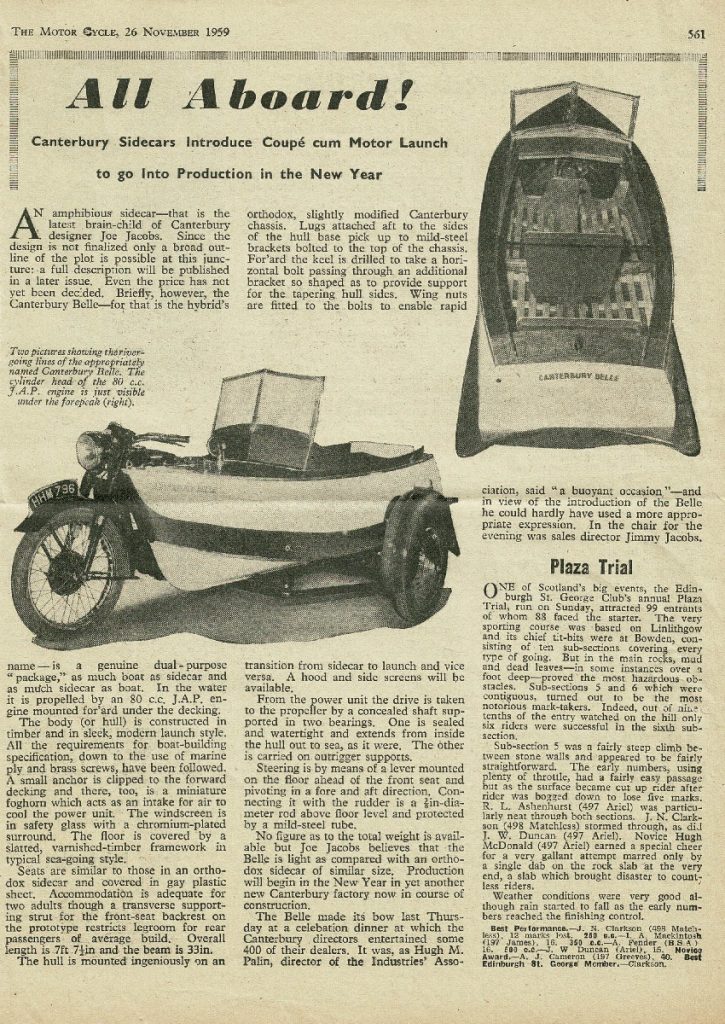 From the contact us, we got another enquiry asking “What was the Canterbury Belle”. I would have at a guess, all of the older sidecarists / sidecar enthusiasts know exactly what is was, so here is a revamped article of Martyn’s plus an a cutting from “The Motor Cycle” Nov 1959.