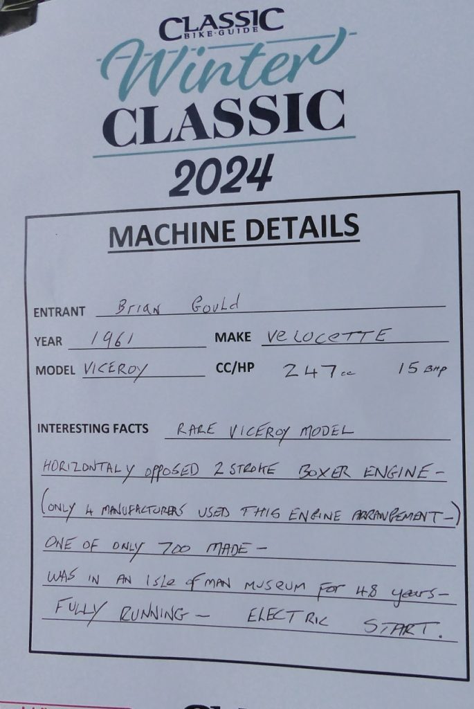 It looked as if it had just come out of the showroom and as the day it left the factory, price under £4000, Martyn said he was pretty sure it would sell well before the day was out. The private entries on display were excellent, one of the bikes was like my first motorbike, which was a James 98cc with a whopping 2 gears and the heady power of 2.8 horses! It looked so small now, it had hand change gears (all 2 of them) and what was called brakes, didn’t look any better than on the James I had.