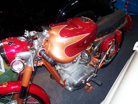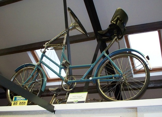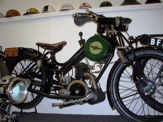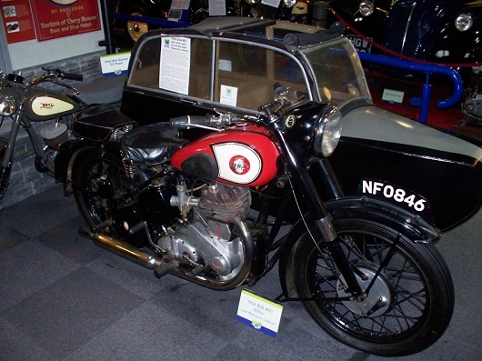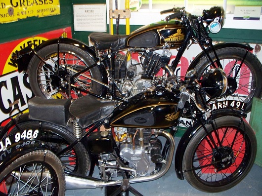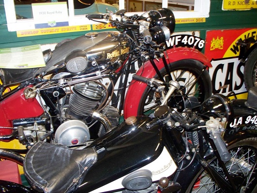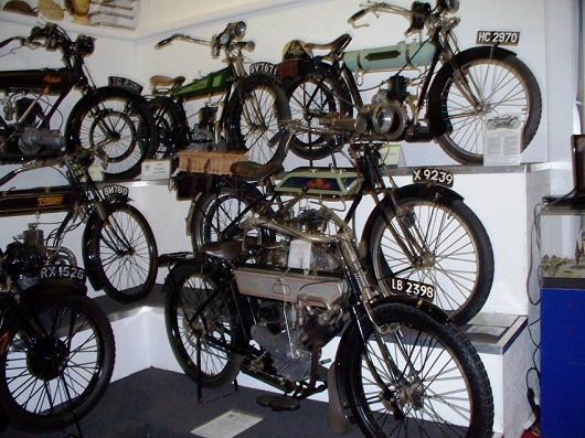 The entrance is via the museum shop, where there is an excellent guide book for sale. Entering the main hall, immediately on your right, is a group of motorcycles; these are displayed on three levels or platforms. One of these was a Tussock – a 1919 model, with a 350 cc two-stroke engine with direct belt drive to the back wheel; however there was no gearbox.