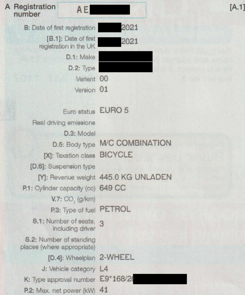 I have kindly been given permission to use a copy of a current V5 of a motorcycle combination registered in 2021, where it has been registered as a complete Outfit at new. (e.g. Ural or Chang Jiang)