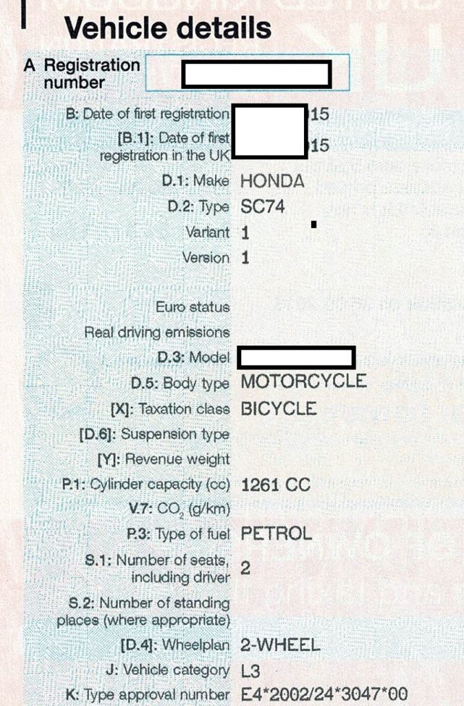 For comparison I have, below an example of a V5 for a motorcycle to which after purchased a sidecar was attached